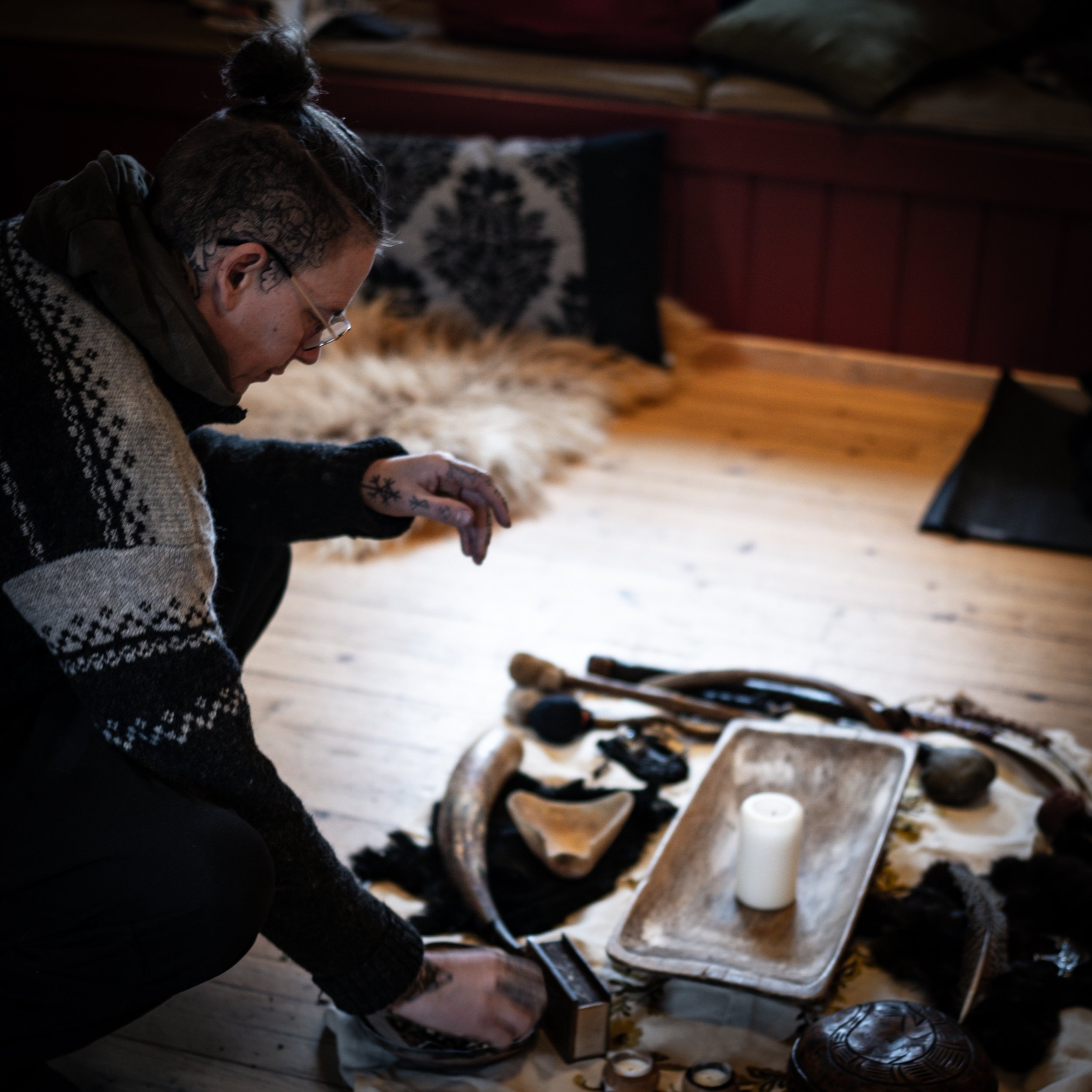 Aftenen afsluttes med et ceremonielt ritual og indvielse af kraftrunerne, der markerer en dyb forbindelse med disse tidløse symboler.